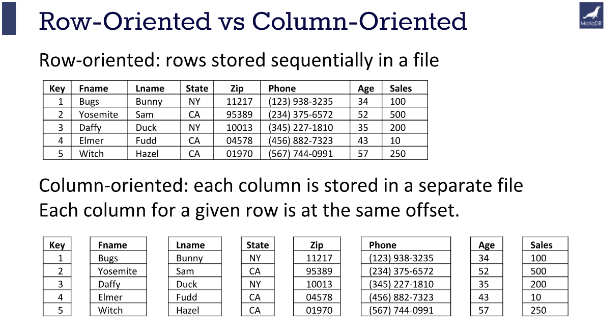 이러한 요건을 만족시키기 위해서 일반적으로 Row-Oriented storage방식으로 접근한다. 각 Row를 기반으로 데이터를 바라보며 데이터의 정합성, 이를 위한 데이터 정규화 등을 수행한다.